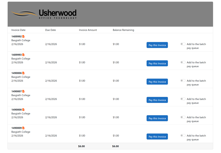 - To pay multiple invoices check the button that says “Add to the batch pay queue” on each invoice that you wish to pay. Then click the Pay button at the top or bottom of the screen. and then fill in your payment information on the resulting screen.
