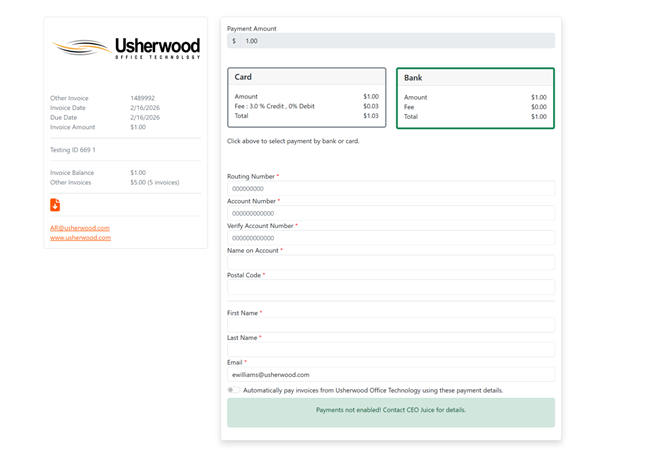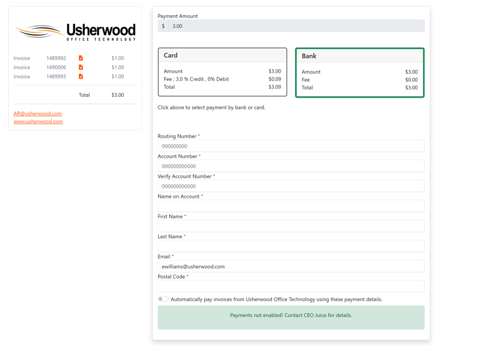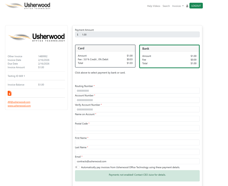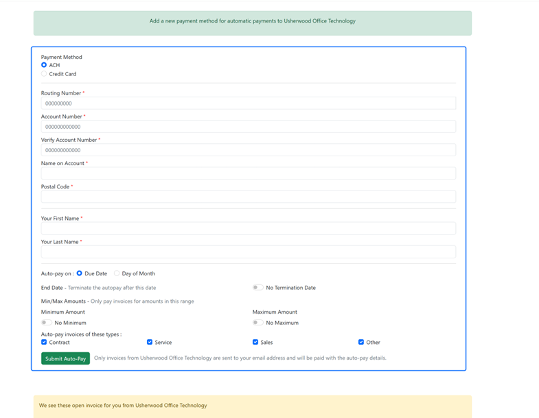 Please note- to be able to set up auto pay you must have at least one invoice associated with your log in email. In order to have an invoice associated your email must be receiving the invoices. If you are not receiving the invoices and wish to start please reach out to AR@usherwood.com.