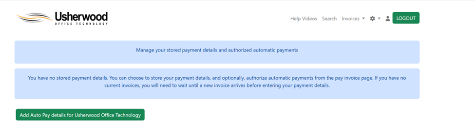 To add a new auto-pay schedule click the “Add Auto Pay details for Usherwood Office Technology”